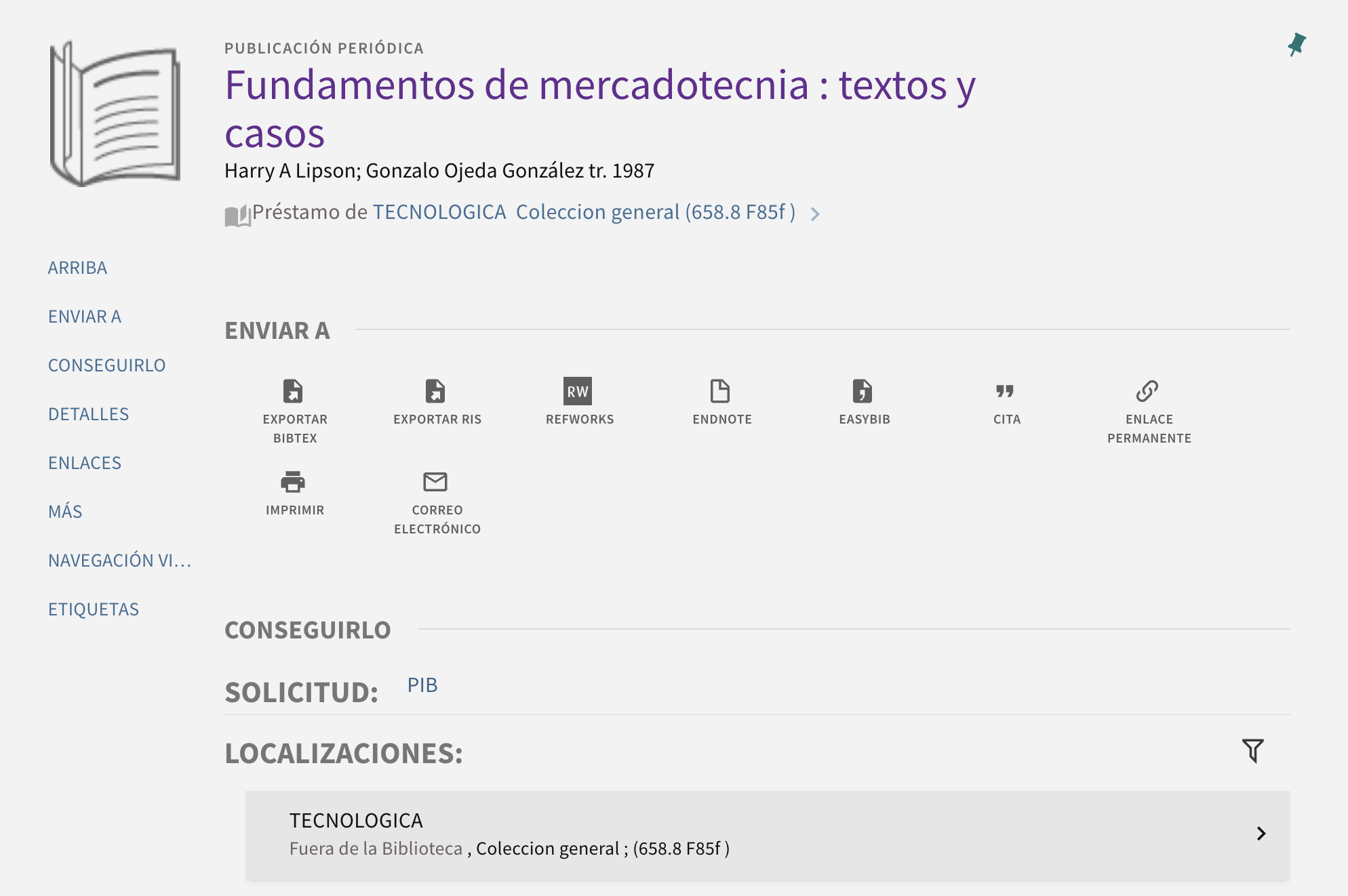 En caso de que la colección sea abierta, buscar el material utilizando el número topográfico que indica el ítem y la biblioteca a la que pertenece, tal como se muestra en los resultados de búsqueda.